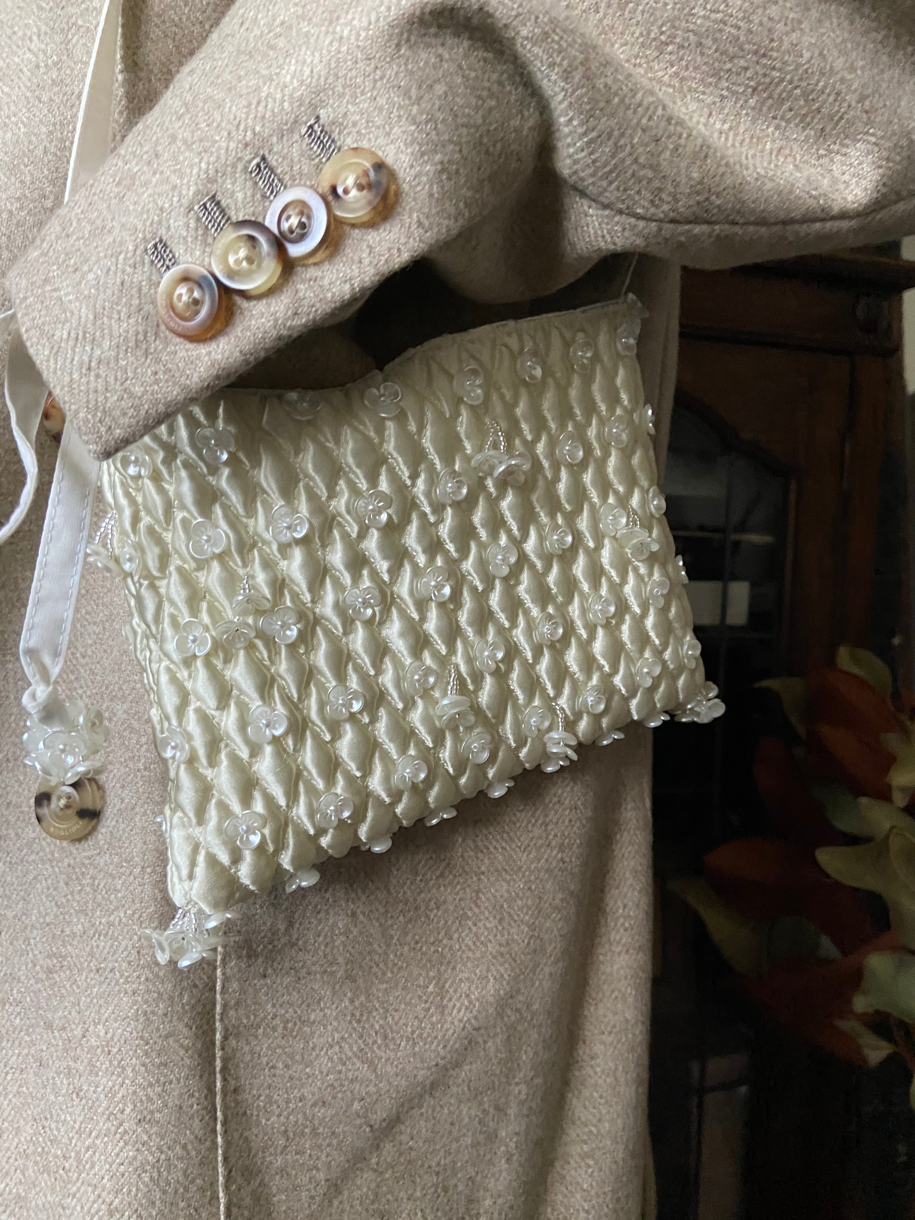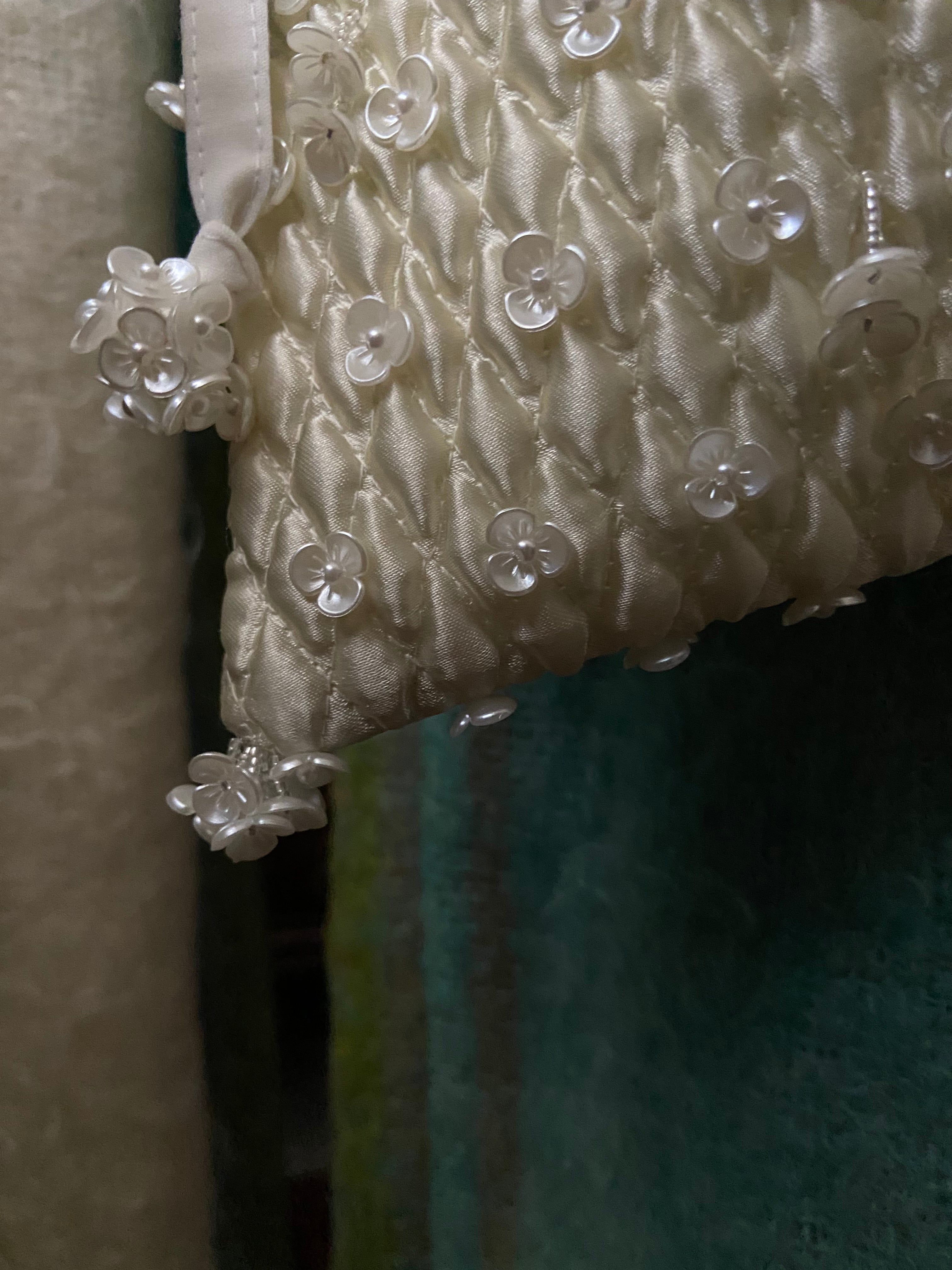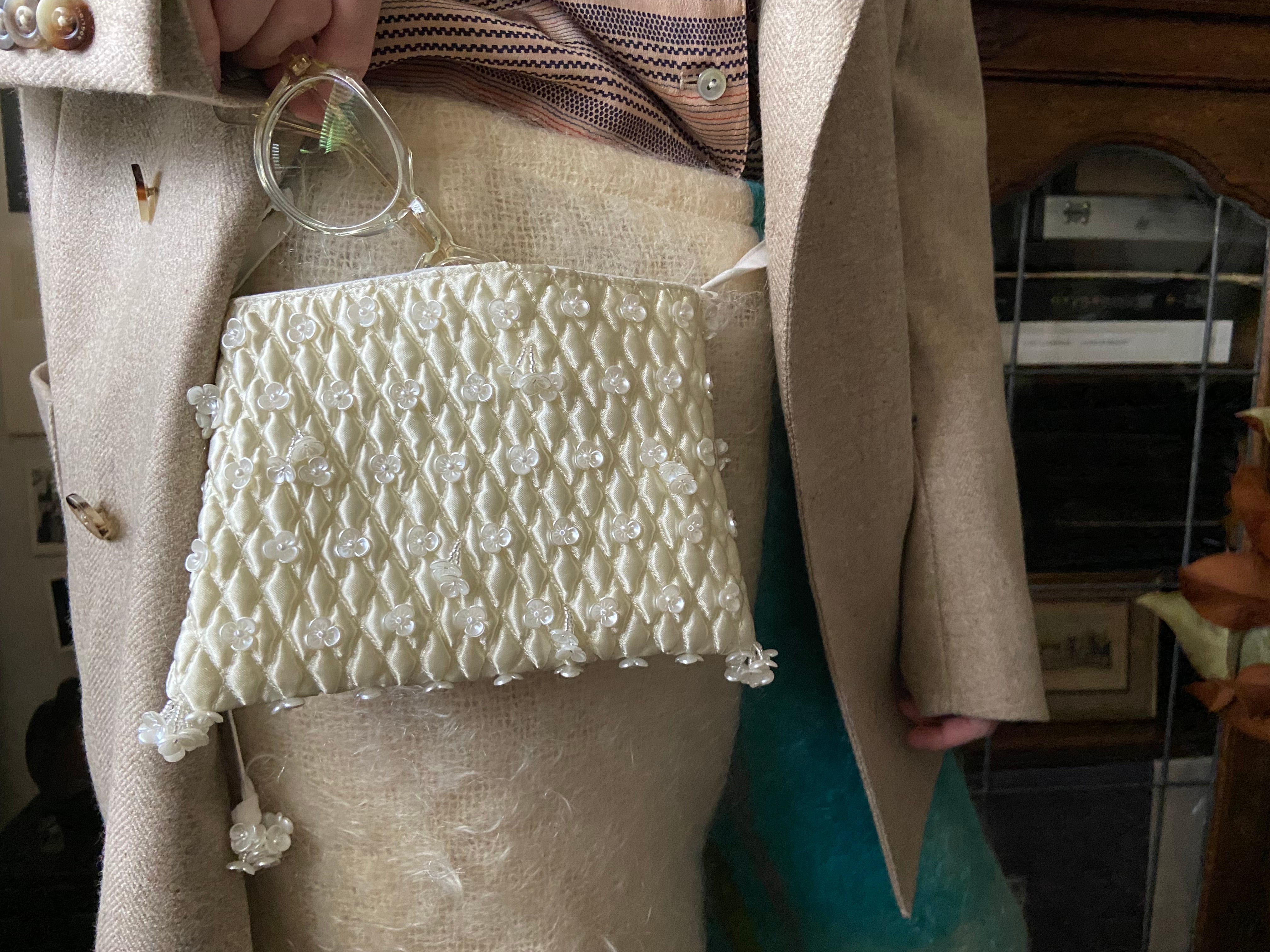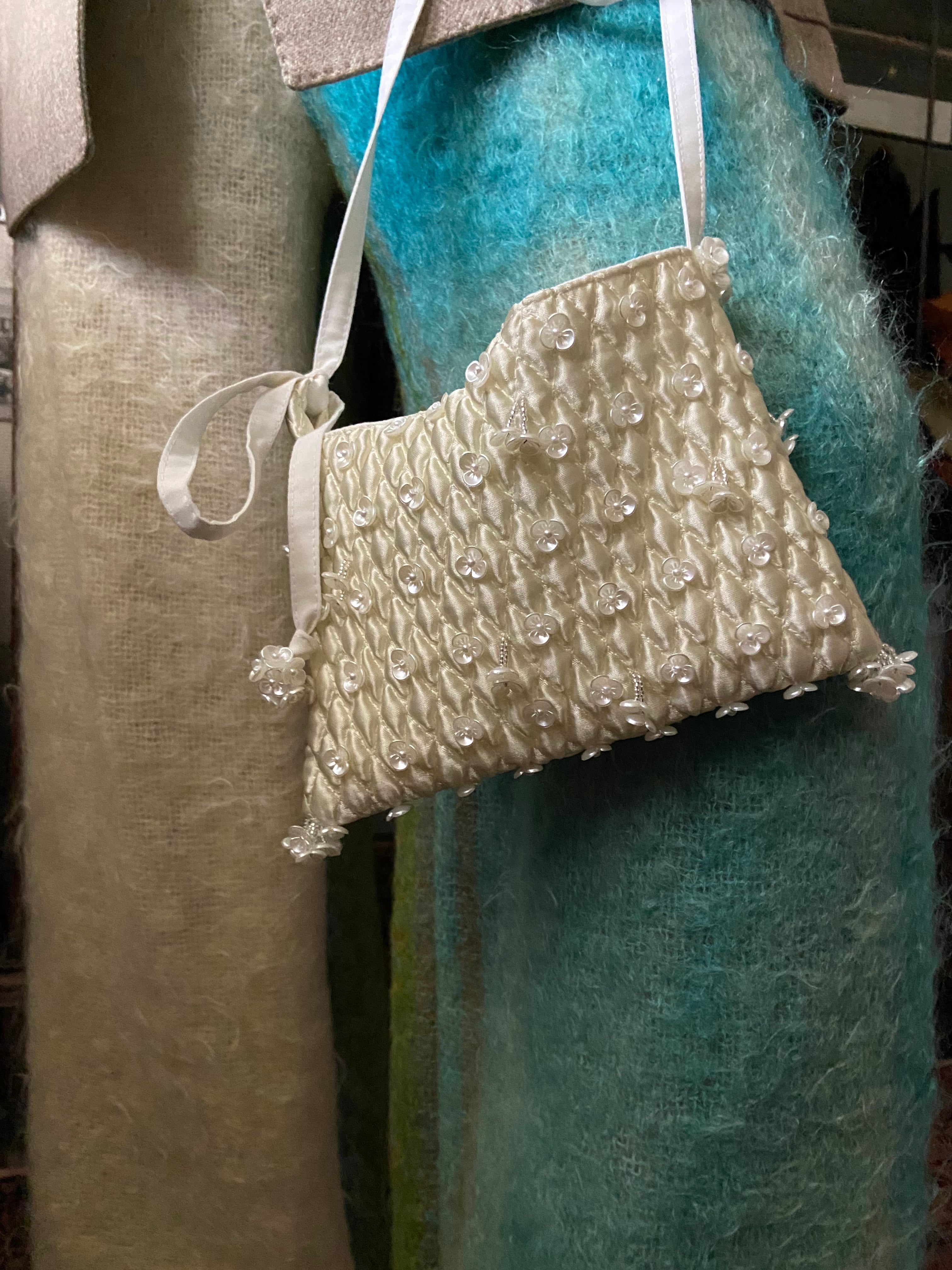 ヴィンテージのシルクキルティングにフラワーモチーフのビーズが散りばめられたポシェット