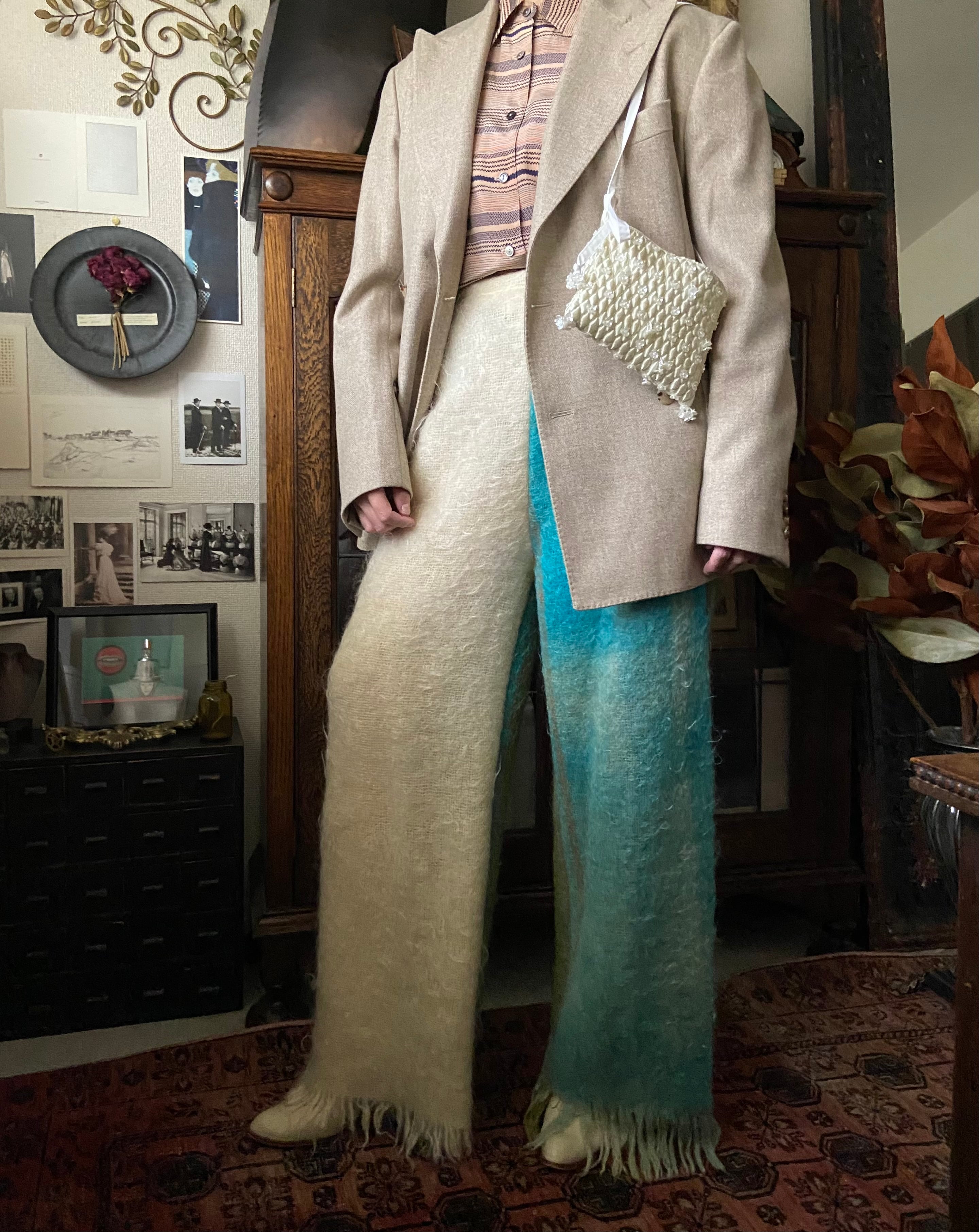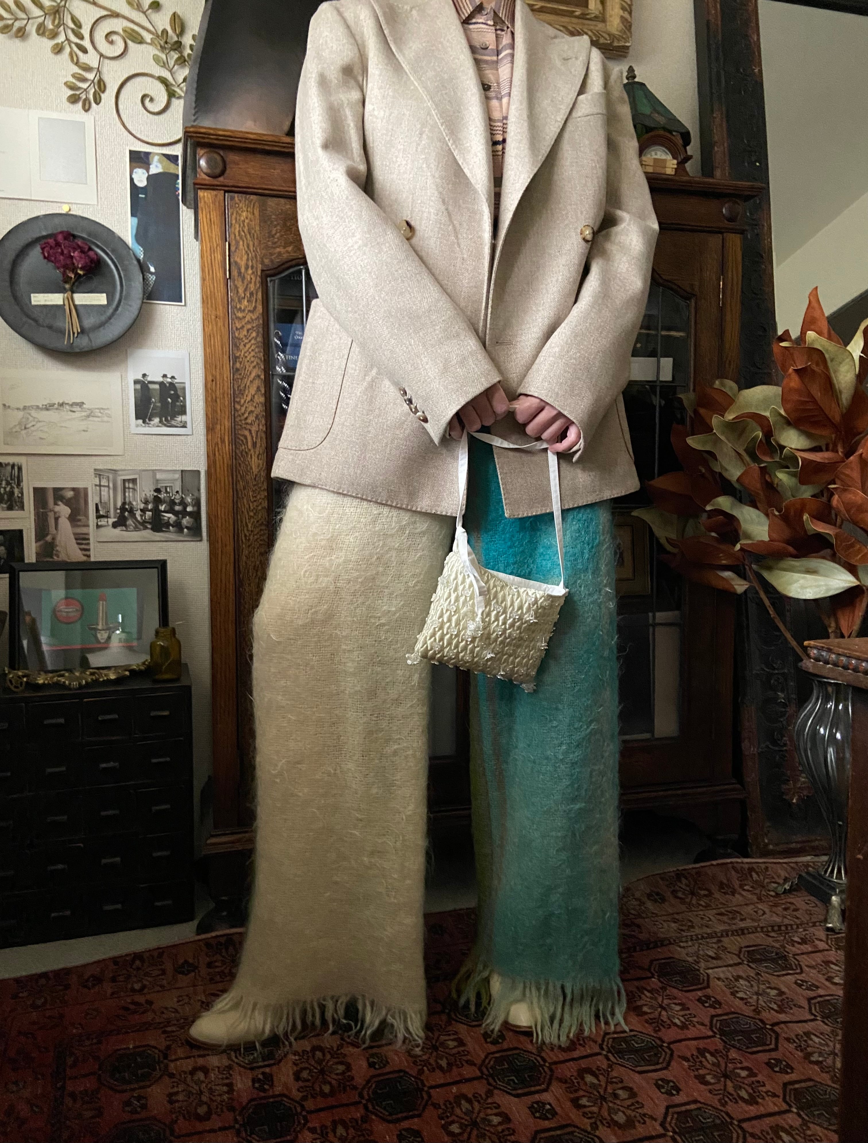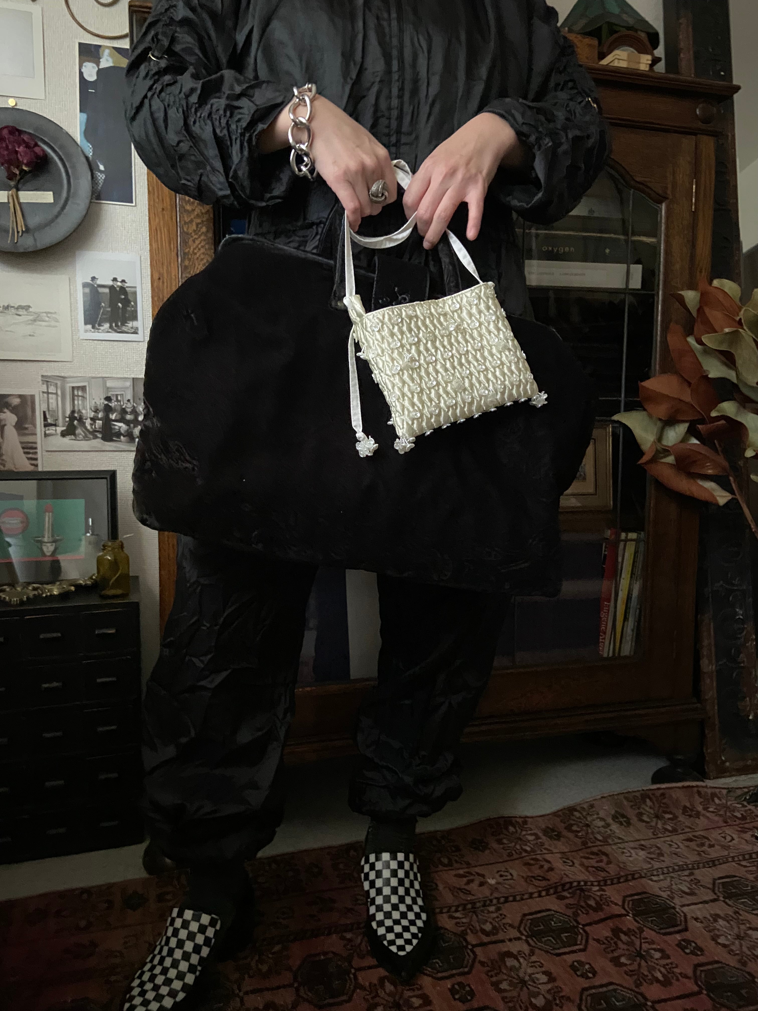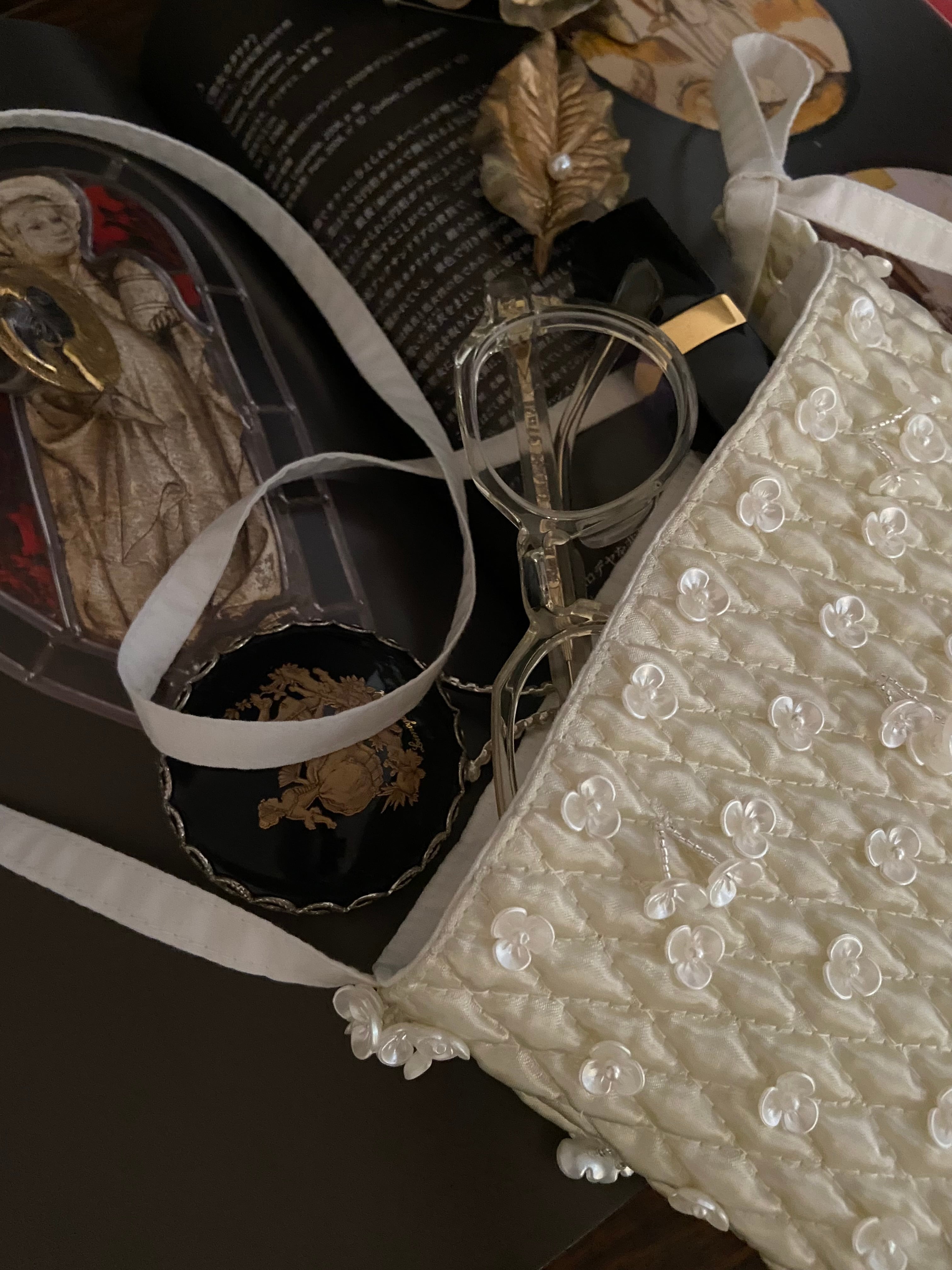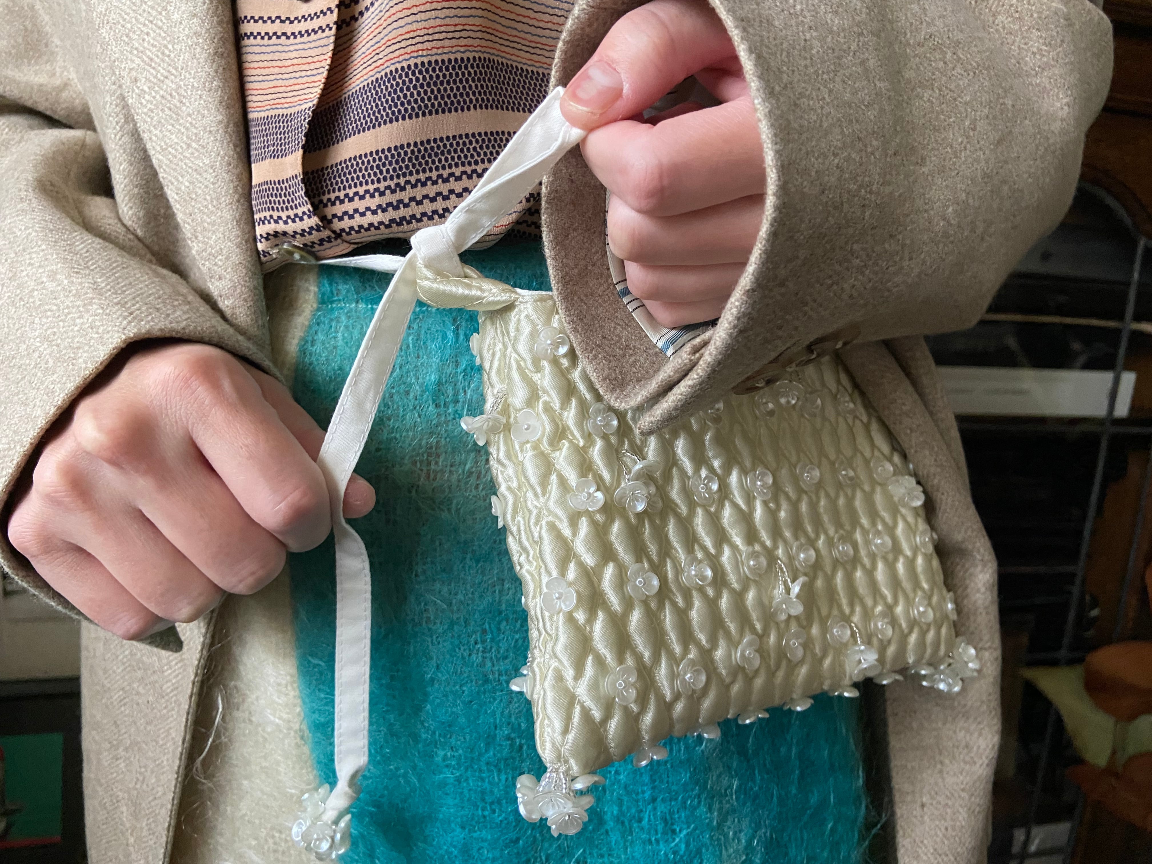 ヴィンテージのシルクキルティングにフラワーモチーフのビーズが散りばめられたポシェット