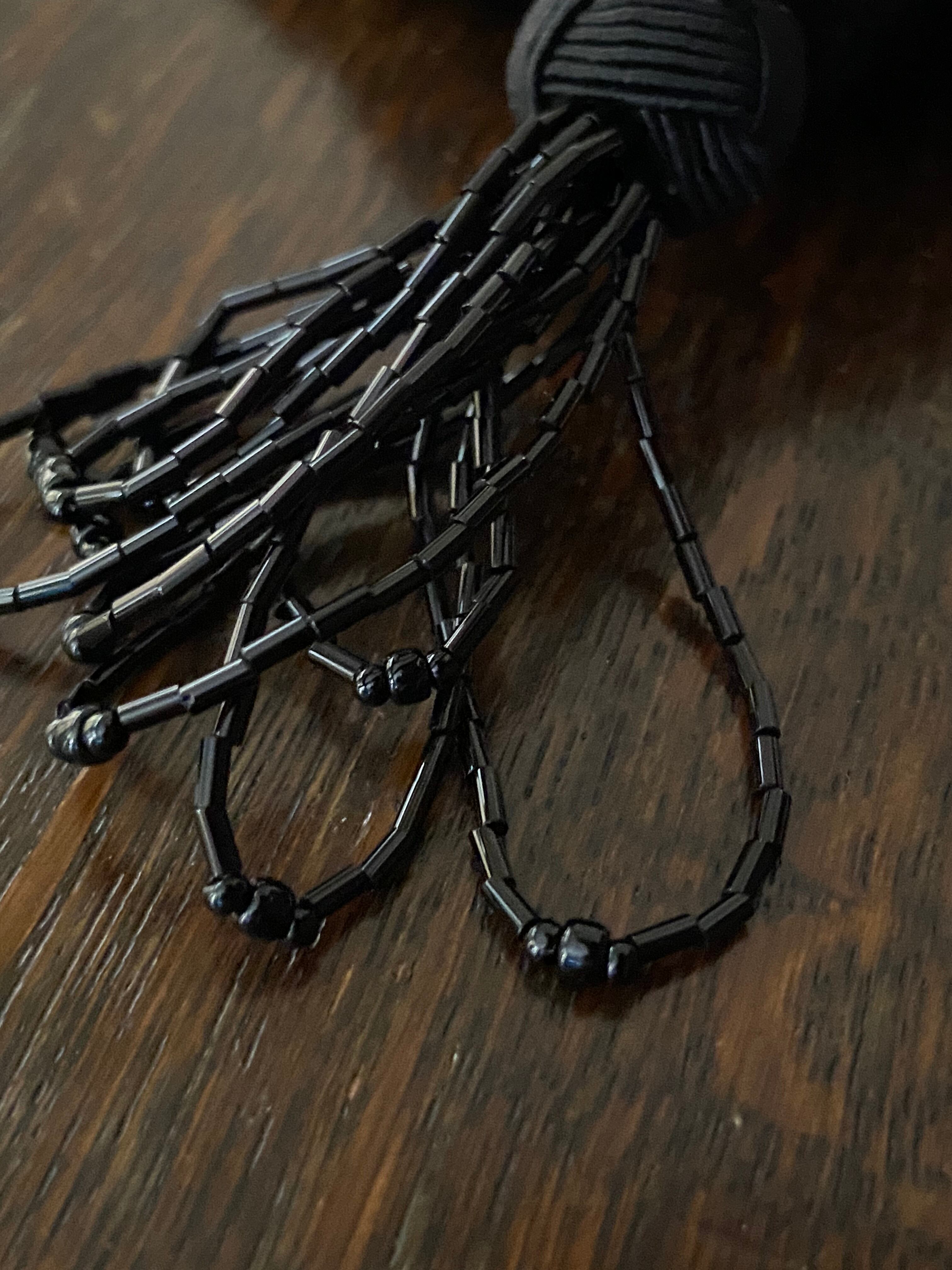 ポシェットの左右底には、複数のビーズが直線的に連なったフリンジのモチーフ