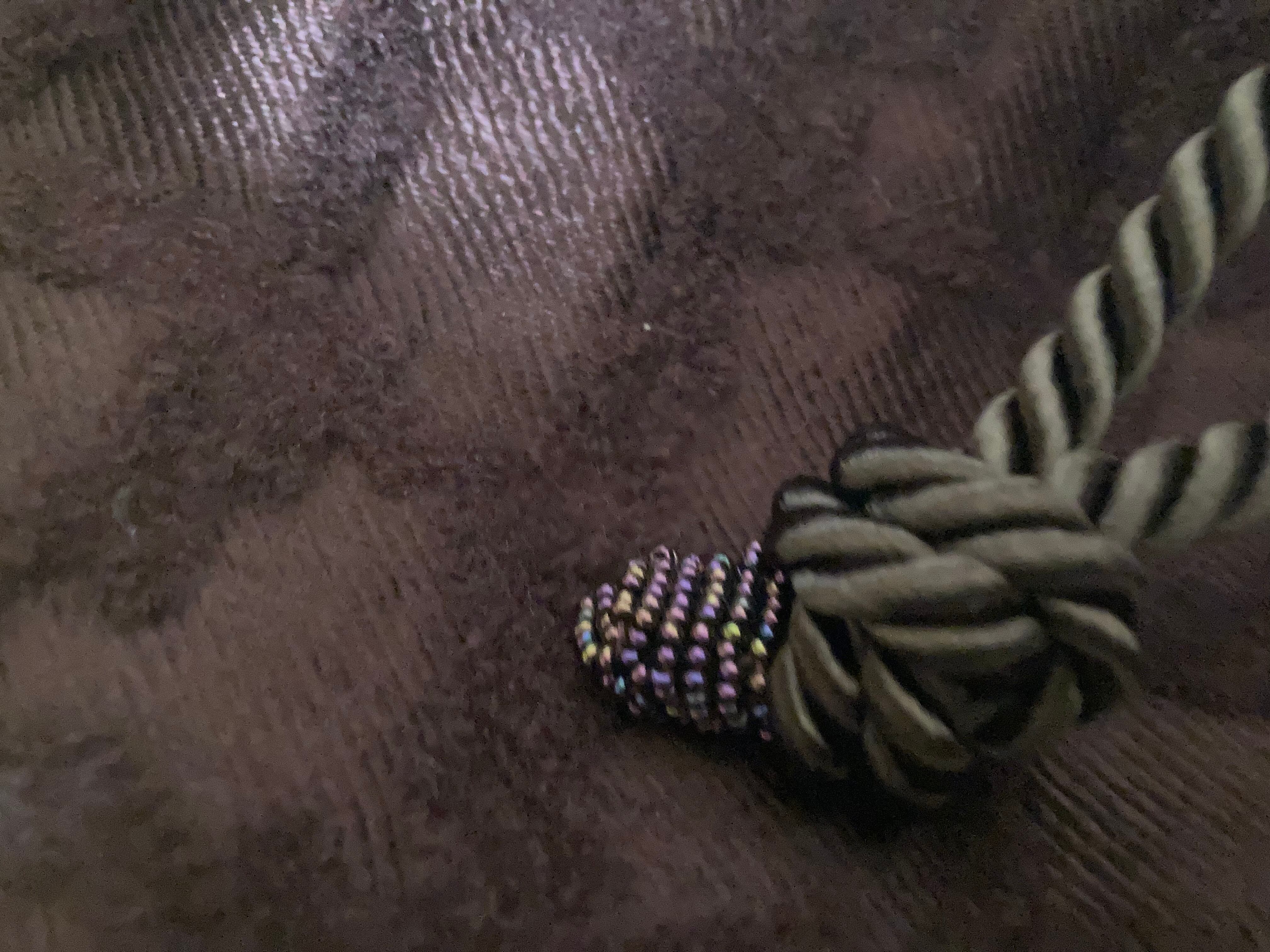 ブラウンの紐先にはパープルのヴィンテージビーズを縫い付け